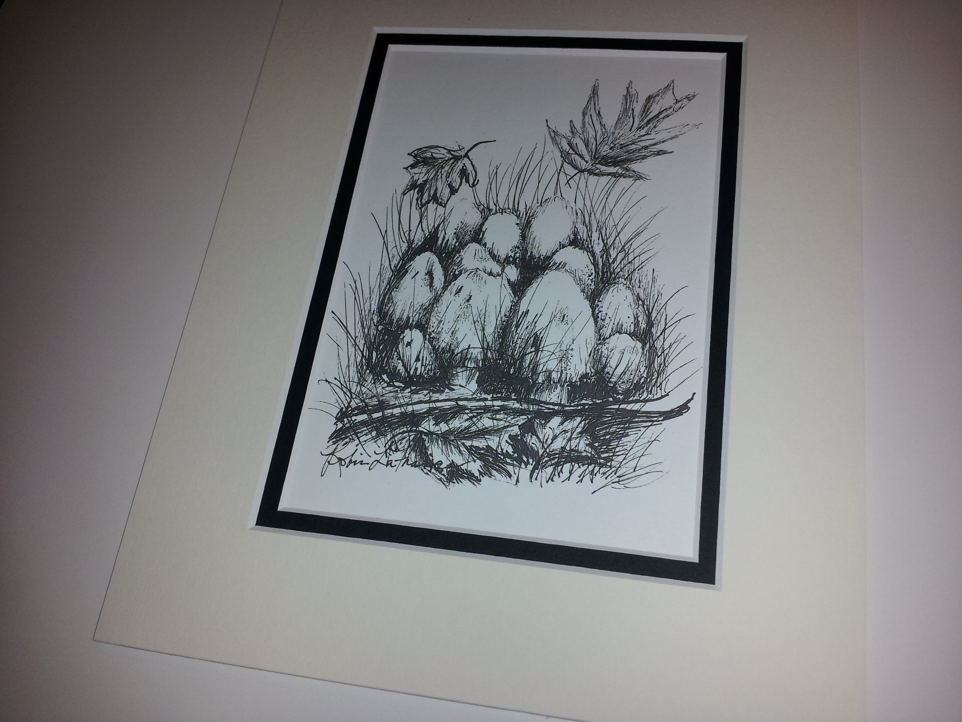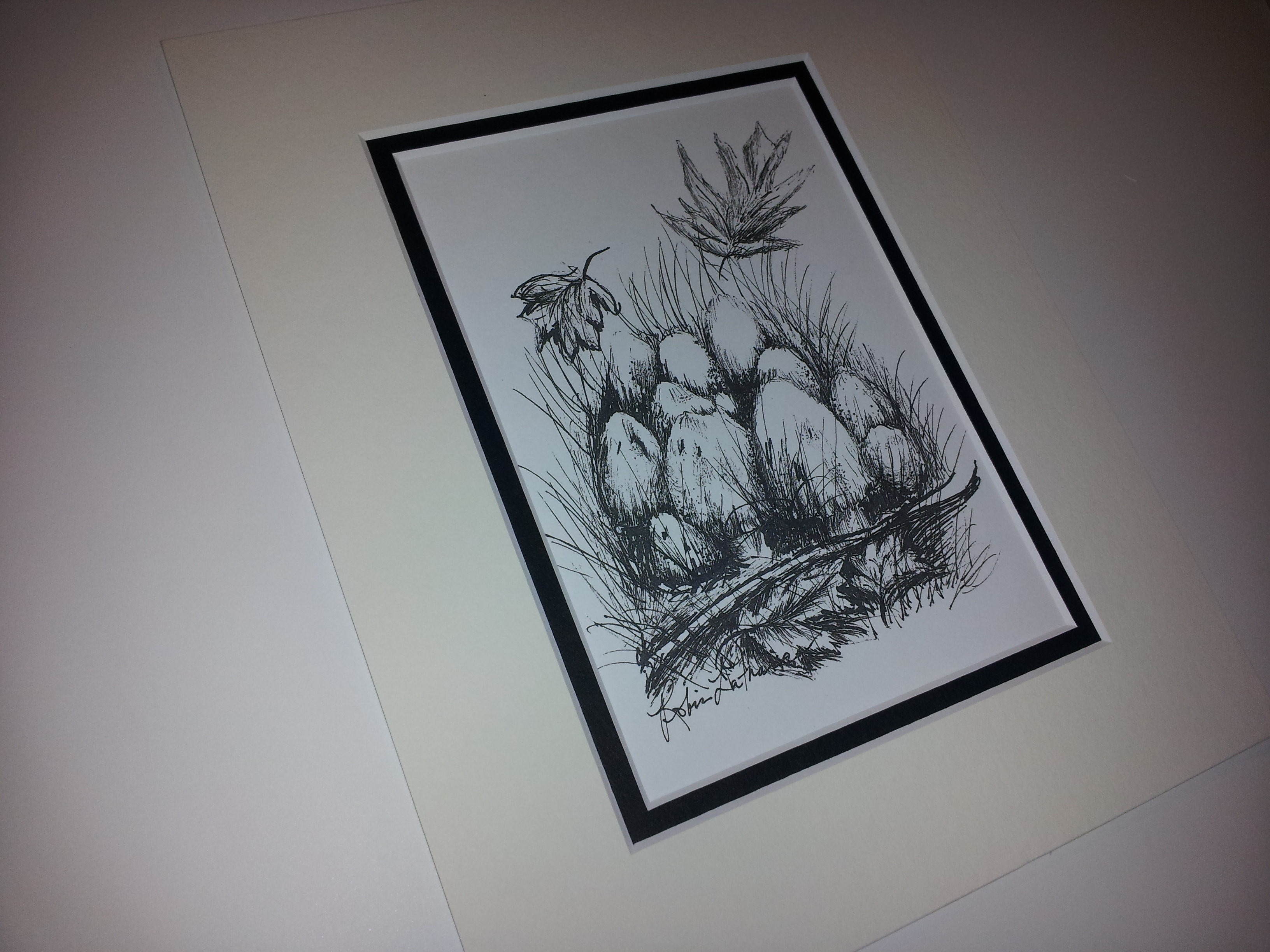 A whimsical interperatation of a a fresh mushroom hatch emerging from the ground. Original sketch done in India Ink shown here, printed on white card stock, in a 5 x 7 matted in a black bevel on white matte, ready for framing. Shipped in a celo sleve on foam core back in a flat mailer. Frame and matte not included.