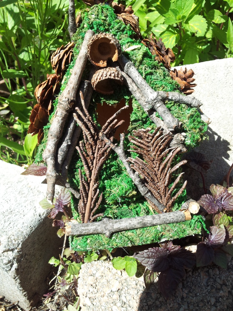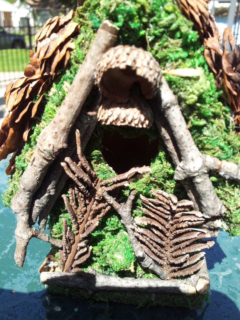 The Woodland Fairy thrives in dense undisturbed vegetation. Near a Brooke or a gentle stream, he searches for that perfect piece of moss, or twig building his dwelling one stick at a time. and just a wee bit o'magick. Complete with Faery Touchstone, this home is sure to satisfy the most demanding of garden gatherers. :) Place in Florida room, Screen porch, outdoor shelter, or any room of the house.