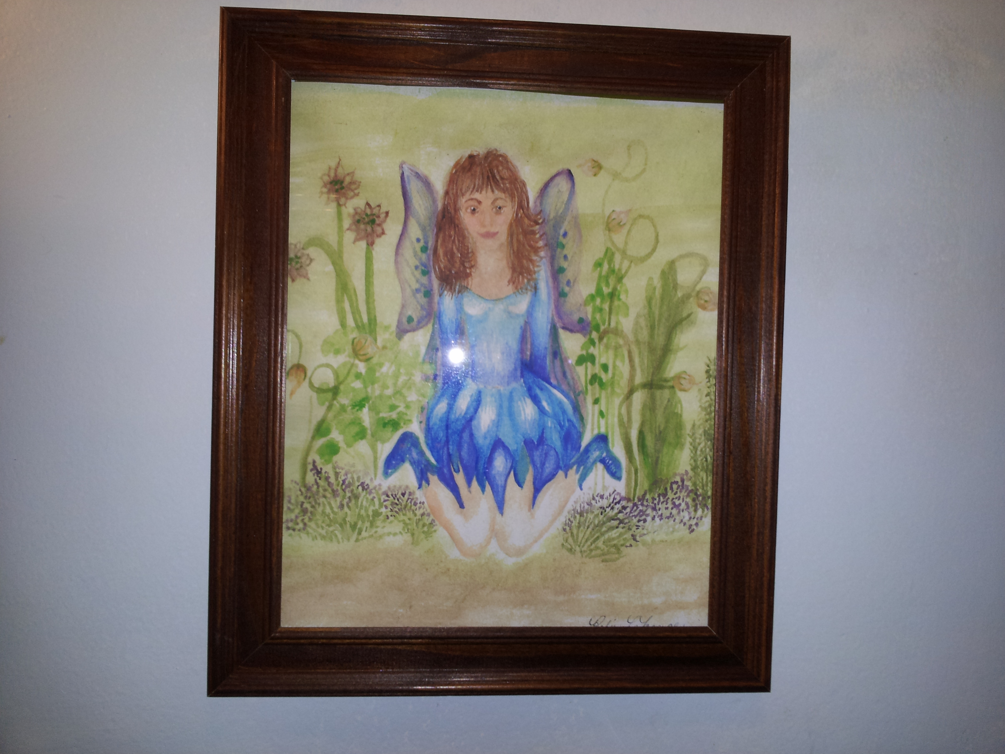 The Garden Fairy original water color print will add a touch of whimsy to any room in your home. A mystic touch to your personal home spa bath as shown in the photo or the perfect addition to your fairy collection. 8'x10' framed in pine.