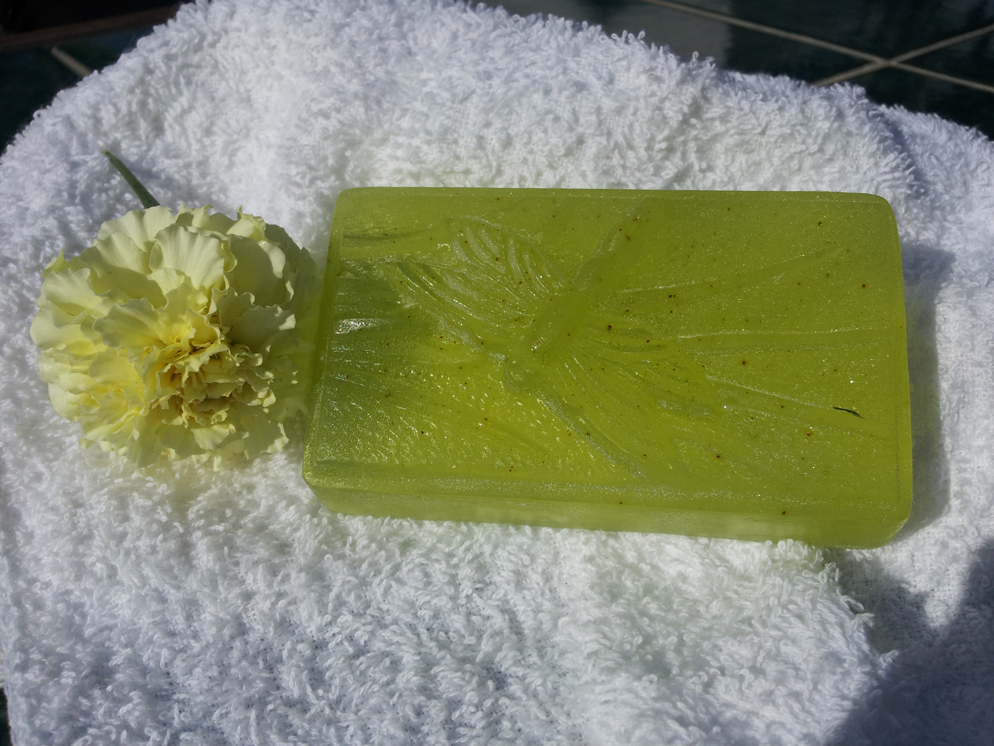 Delightful spring floral scent with a hint of pear fruit. Clear glycerin soap, Pear Blossom fragrance oil, coconut oil, a touch of yellow and blue food safe color.