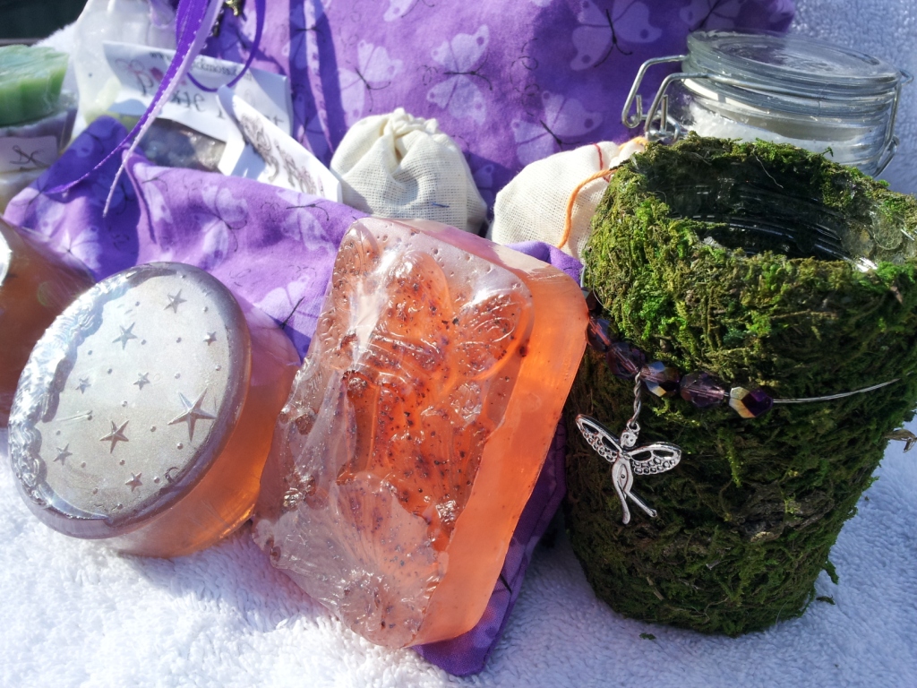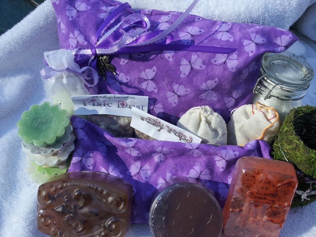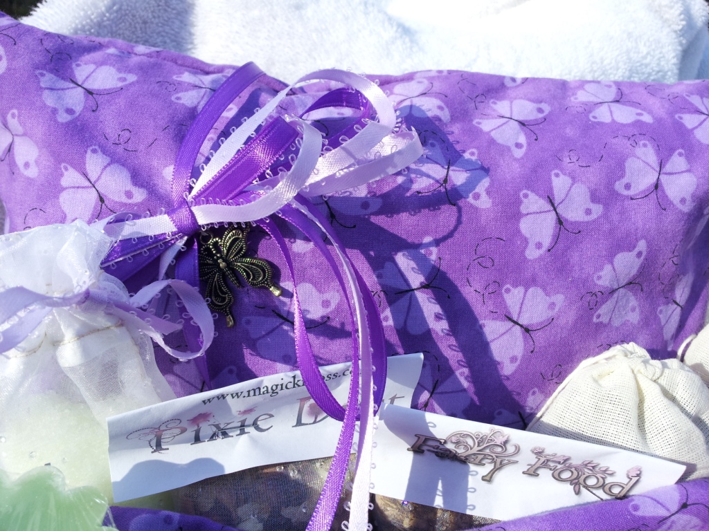 This lovely Personal Home Spa Kit boasts a vibrant purple with lavender butterfly print. Your kit will include 1 dream sleep pillow adorned with a butter charm and ribbons, 1 soothing lavender/rice eye pillow. 1 fairy rose soap, 1 dragon's blood soap, 1 lavender soap, 2 guest soaps, 1 fairy charmed candle holder, 2 bath salts, 2 fairy food sachets, 2 dream sleep formulas and 5 soy wax tarts or melts. 100.00 value if purchased separate.