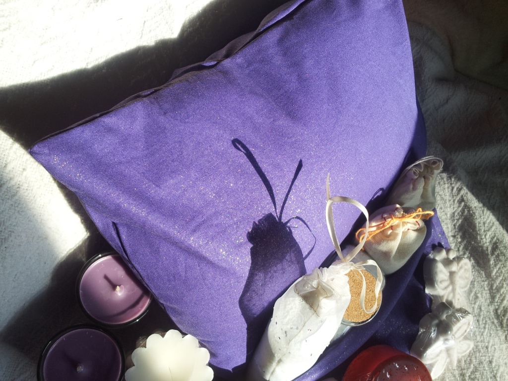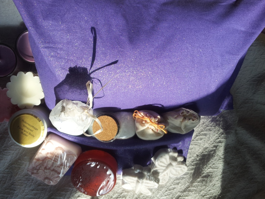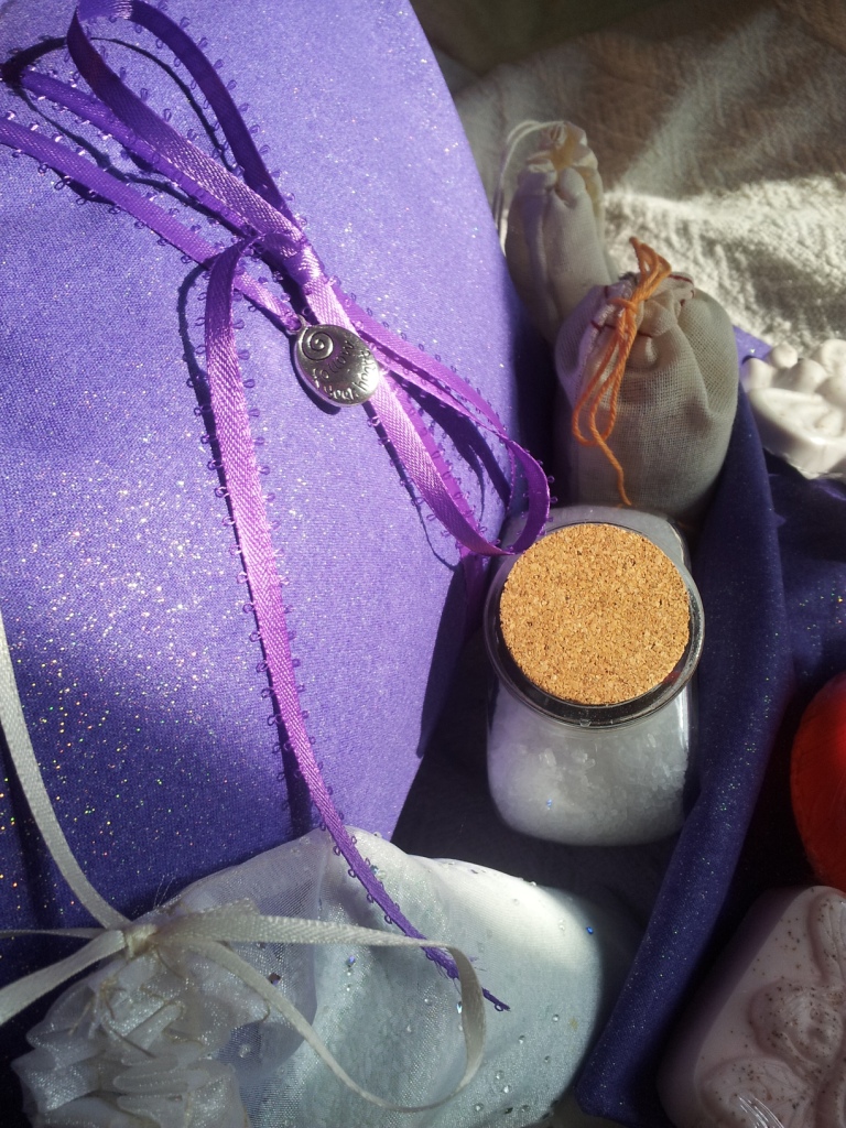 Aromatherapy Home Spa Kit in Purple glitter and a mixture of some our premium bath and body products. If you start with lighting a candle or a wax melt you are setting a mood ( so many fragrances to choose from), next draw yourself a hot bath(personal jet tubs also), pick a fragrance. Next butter your whole body with your all natural body butter. Now get dressed or undressed and listen to your favorite music with your Soothing Eye Pillow for at least ½ hour. Watch some TV. Place your had made soaps around the house for daily use, and a reminder that you can have soft skin all year ‘round. Last but not least place your Dream Sleep Pillow next to your pillow or bedside and breathe deeply for 60 seconds to relax and fall into a deep slumber. Your personal home spa kit will include; 1 10” x 14” dream sleep pillow, 1 soothing lavender/rice pillow. Both dream pillow and eye pillows have removable covers for easy cleaning. 1 lavender essential oil bath salts in a heart shaped apothecary jar, 1 7 oz glitter bag of Pear Blossom bath salts, 1 4 oz jar of Body Butter made from coconut oil, Shea butter, Sunflower oil, Lavender essential oil, and Rose water concentrate, 2 , 2oz soy wax votive s in votive glass holders, both in Love Spell fragrance, 2 guests soaps in Lavender,rose essential oil, and 2, 5 oz soaps 1 moon and stars design in rose and rose hips and 1 in garden fairy, lavender essential, 4 soy wax tarts in rose, 2 tranquility, 1 day at the spa, 1 fairy's breath, and last but not least 2 dream sleep herbal formulas, 1 jasmine/rose/hops and 1 lavender/chamomile. All for 59.00, if purchased separately a 94.00 value and a very thoughtful gift.Custom Kits can be designed. Contact me for ideas, colors and fragrances.